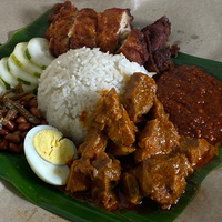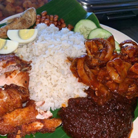 + Nasi lemak 200 gram+ Sotong masak merah 20+- gram+ Sambal nasi lemak+ Ikan bilis+ Telur rebus 1/2+ Kacang+ Timun